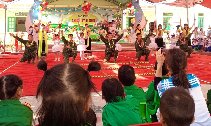 Sân chơi “Chiến sĩ tí hon” của cô và trẻ trường mầm non Hùng Tiến cùng với sự tham gia của các chiến sĩ Lữ đoàn 229