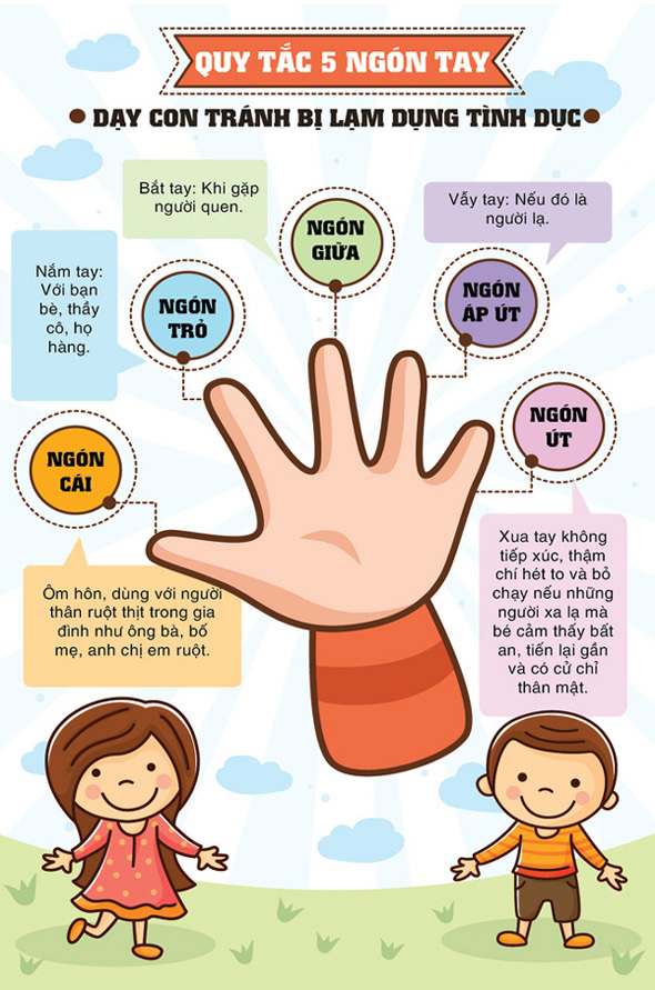 - Để giúp trẻ tránh bị xâm hại tình dục, một trong những quy tắc bố mẹ có thể dạy con là "quy tắc 5 ngón tay". Quy tắc này cực đơn giản, sẽ giúp trẻ có thể tránh xa những đối tượng nguy hiểm và bảo vệ chính bản thân mình.