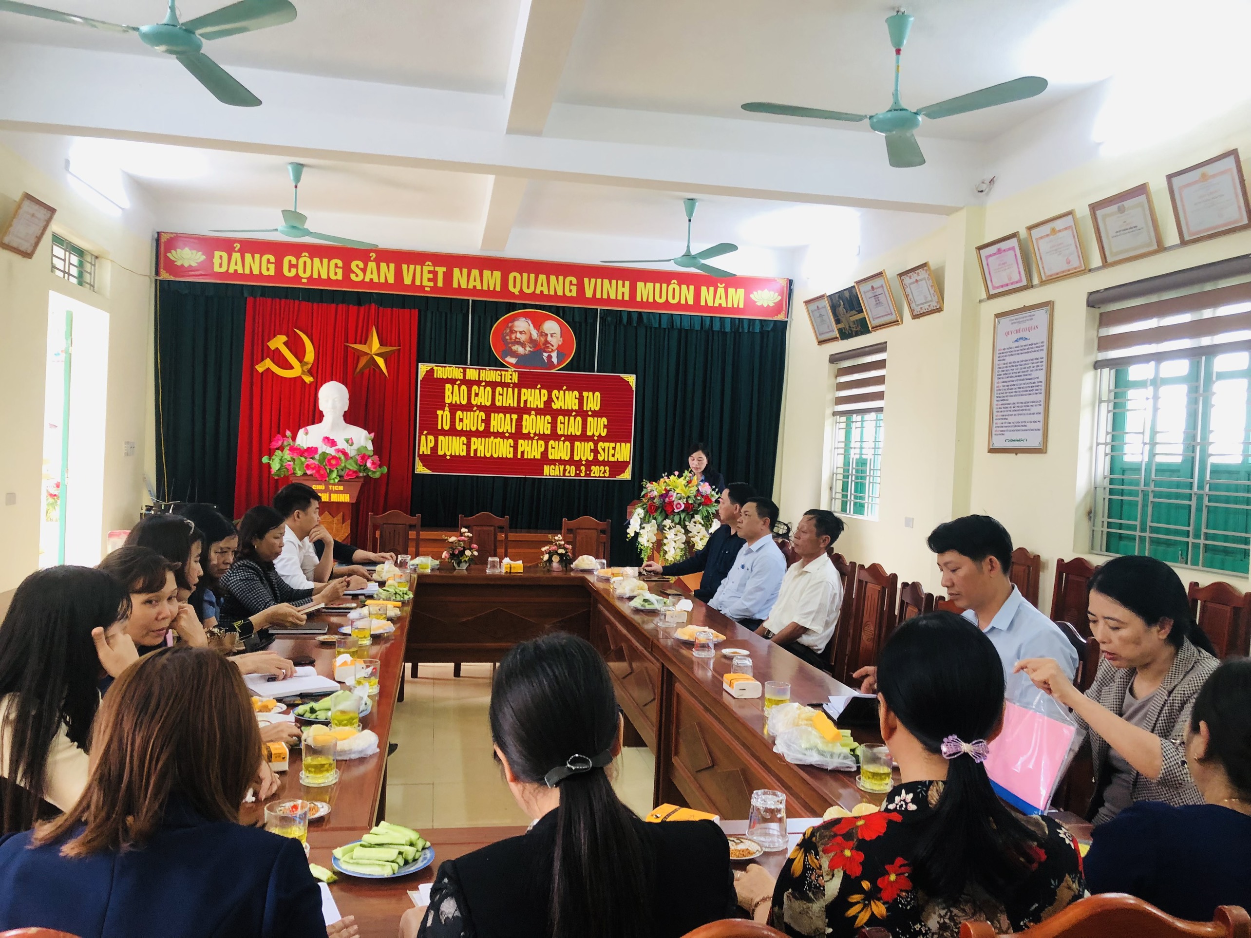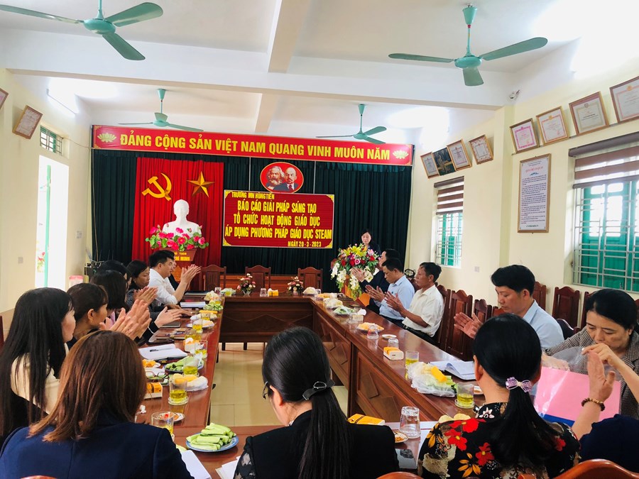 Phát biểu chỉ đạo tại buổi báo cáo giải pháp, đồng chí Phạm Hữu Du - Chuyên viên phòng giáo dục đã ghi nhận những nỗ lực, cố gắng trong công tác đổi mới dạy học của trường Mầm non Hùng Tiến và rút kinh nghiệm cho nhà trường. Đồng chí đã định hướng, gợi mở cho nhà trường những cách thức thực hiện ứng dụng phương pháp giáo dục STEAM trong giáo dục mầm non và nhiều biện pháp giúp nâng cao hiệu quả giảng dạy trong thời gian tới.