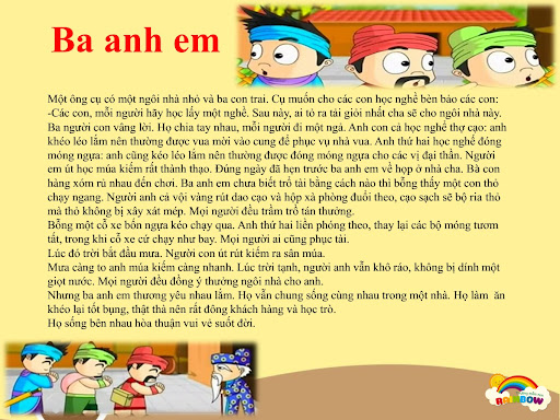 Câu chuyện kể về người bố có 3 người con trai, một hôm ông bảo 3 người con: Các con mỗi người hãy học lấy một nghề. Sau này, ai tài giỏi nhất cha sẽ cho ngôi nhà này. Ba người con đã vâng lời và họ chia tay nhau mỗi người đi một ngả, đến ngày hẹn 3 anh em trở về và ai cũng trở lên tài giỏi. Mọi người đều đồng ý thưởng ngôi nhà cho người em út nhưng 3 anh em yêu thương nhau lắm nên họ vẫn sống chung cùng nhau trong một ngôi nhà. Họ sống bên nhau hòa thuận vui vẻ suốt đời.